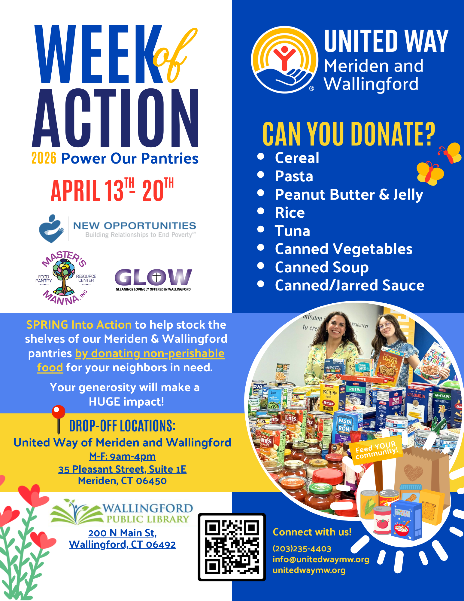 Our United Way of Meriden and Wallingford will be launching “Week of Action” this April to respond to this growing need with a 1 week in-person drive to collect nonperishable food items for local food pantries: